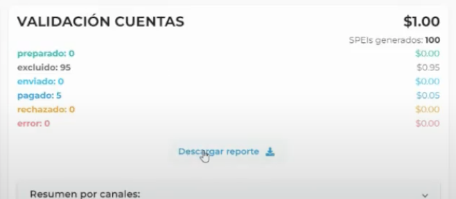 - Descargarse el archivo CSV de validación de cuentas y filtrar sólo aquellos registros que se encuentren categorizados como excluir para cargarlos en el submódulo Modificación de SPEIS, desde la opción Resumen de Operaciones, validación de Cuentas, descargar Reporte operación.
