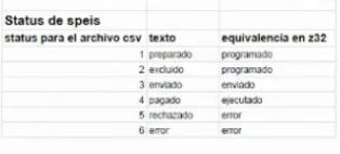 - Se debe preparar el archivo en formato .CSV con el layout de campos requeridos para aplicar el cambio y guarda para posterior carga en la sección de Carga de status de speis. Los campos son: