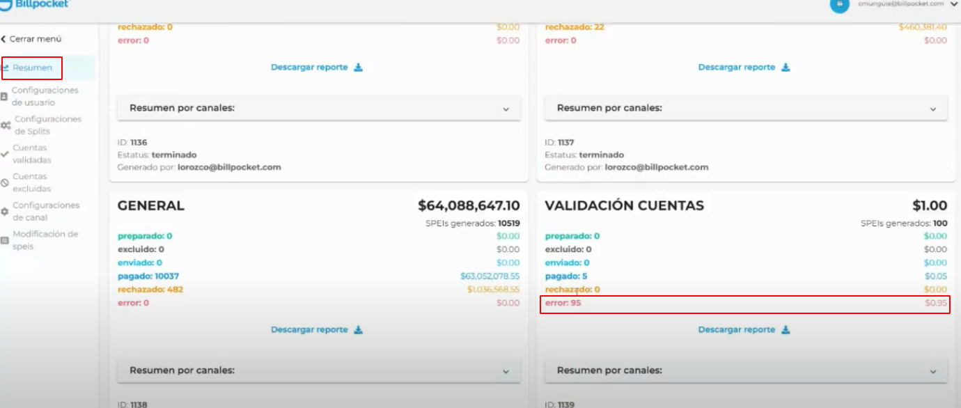 - Para verificar que los SPEIs se encuentran actualizados, regresa a la opción Resumen y en el tablero de STP, Validación de cuentas deben aparecer los registros actualizados con error.